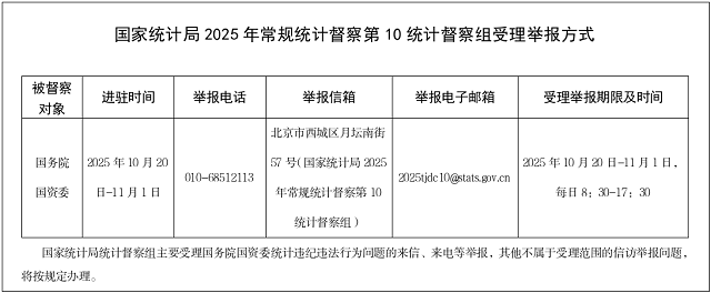为深入贯彻落实习近平总书记关于统计工作的重要讲话和重要指示批示精神,根据党中央和国务院授权,国家统计局2025年常规统计督察第10统计督察组日前进驻国务院国资委开展统计督察工作,实地督察时间13天左右。